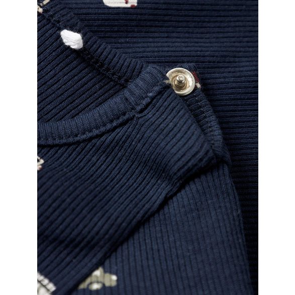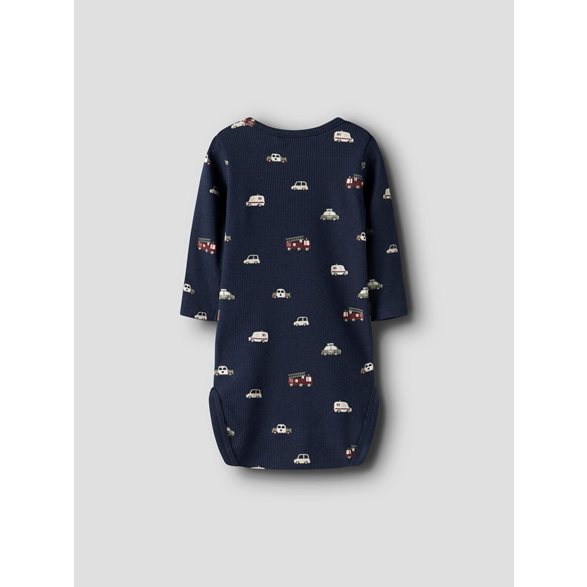 Ribbad, mjuk och skön body med tryckknappar i grenen och på ena axeln. Heltäckande tryck av utryckningsfordon.