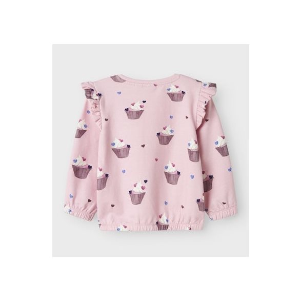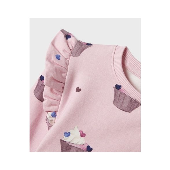 Rosa tröja med cupcakes över hela och en liten volang på axeln.