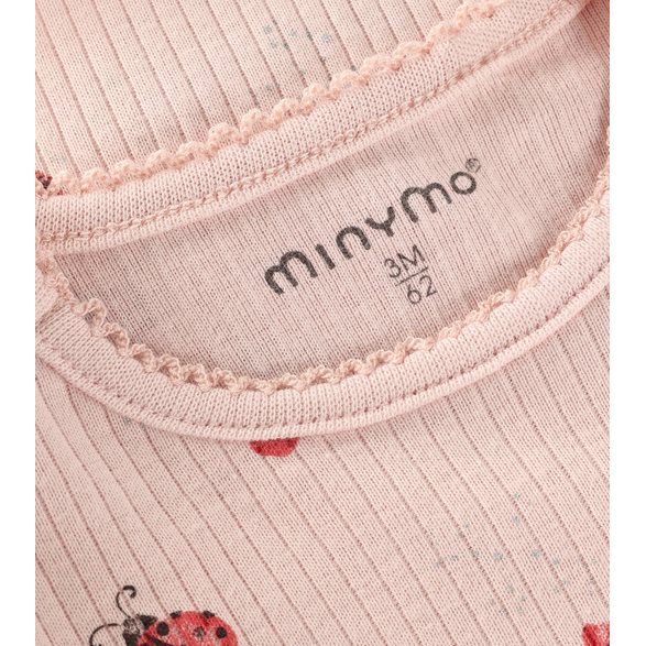 Söt body från Minymo, rosa ribbad med röda nyckelpigor.